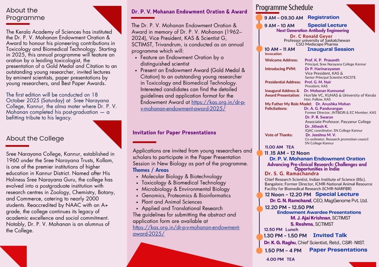 Sree Narayana College, Kannur (Re-accredited by NAAC with ‘A+’ Grade), in association with the Kerala Science Academy, is organizing the First P. V. Mohanan Memorial Endowment Oration Award on Saturday, 18 October 2024, at 10:00 a.m. in the Seminar Hall.