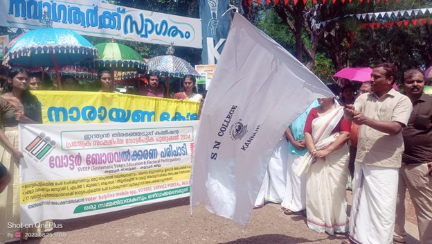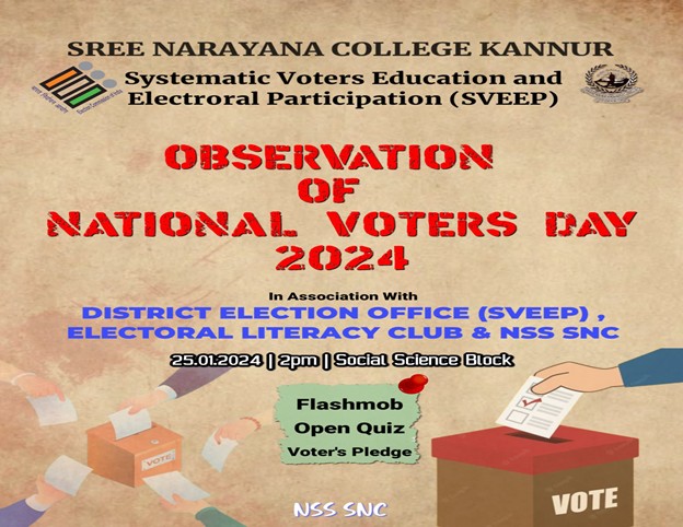 Sree Narayana College Kannur take numerous programmes for new voter enrolment. Last year ELC initiated a massive campaign in the campus for the attainment of 100% voter enrolment. The programme is organized in association with District Election Office, Kannur. As part of the programme District election office provide technical support to the college for new voter enrollment and finally 95% of the above 18 year age students enrolled to the vote. ELC members provide a general awarenes to newly admitted students for registration of vote.